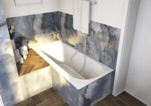 Unser Bad-Design CLASSIC vereint zeitgemäße Gadgets mit klassischen Elementen und schafft ein Bad besonderer Eleganz. Schwarzer Marmor an der Wand und der goldene Kronleuchter verleihen dem Raum einen Hauch von Luxus. Dabei helfen neutrale Farbpaletten mit Akzenten in Gold, Messing, Silber oder Kupfer.
